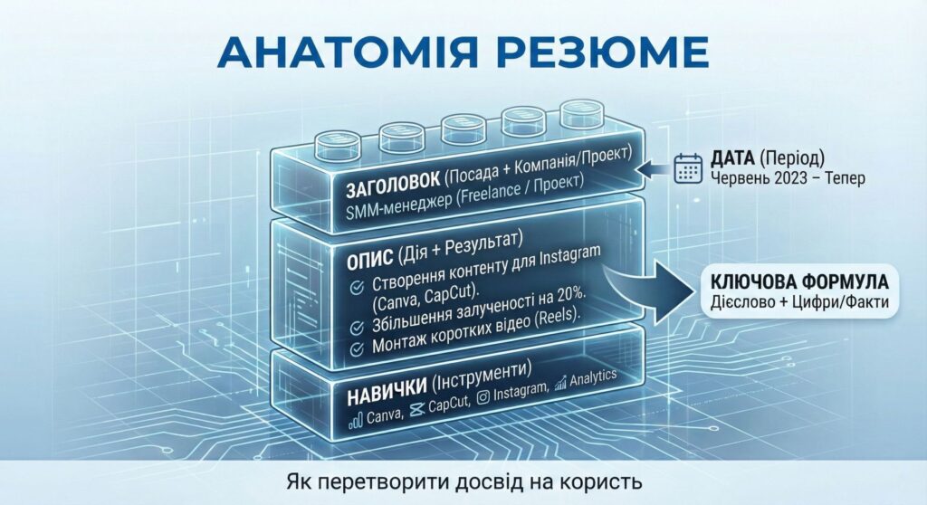 - Акцент у Досвіді: На перше місце ставимо фріланс та блог. Детально розписуємо Reels, Canva.