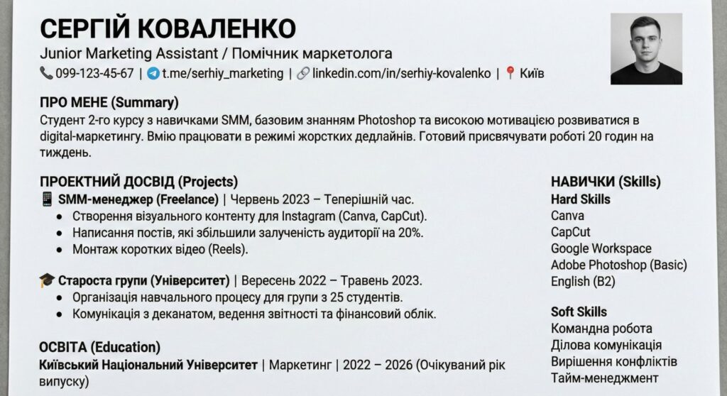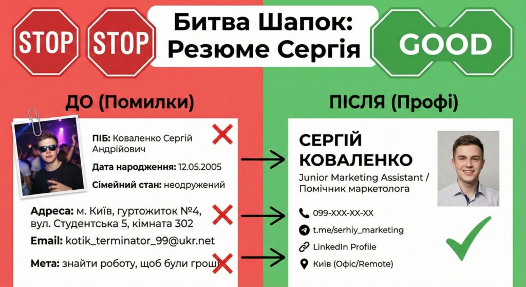 Бачиш різницю? У другому варіанті Сергій виглядає не як “бідний студент”, а як молодший спеціаліст, який знає, чого хоче і що може запропонувати бізнесу.