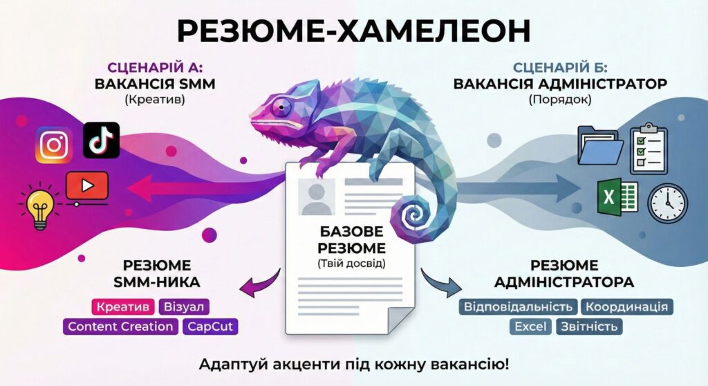 Твоє резюме — це хамелеон. Воно має змінювати “колір” залежно від того, куди ти його відправляєш. Ти не брешеш про свої навички, ти просто змінюєш акценти.