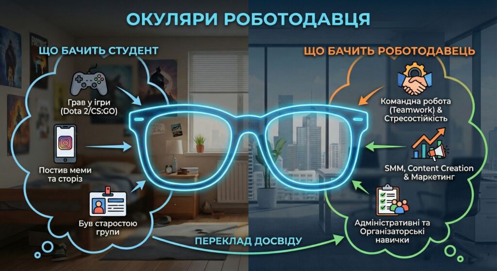 Те, що ти не сидів в офісі з 9:00 до 18:00, не означає, що ти — “чистий аркуш”. Ти живеш у цифровому світі, ти спілкуєшся, організовуєш своє життя. Все це — навички. Наше завдання зараз — провести археологічні розкопки. Ми знайдемо твоє золото там, де ти бачив лише рутину.