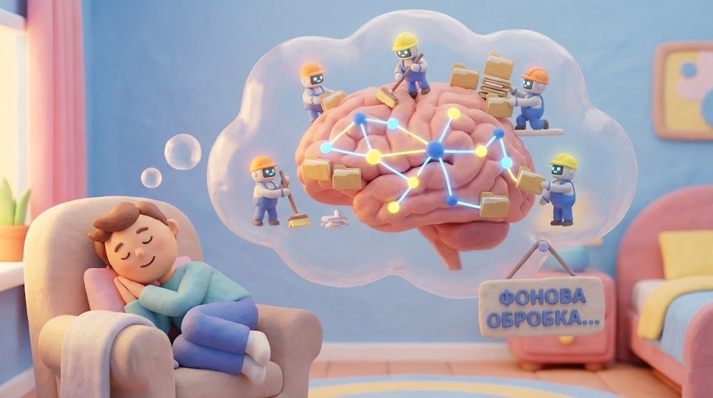 - Консолідація пам’яті: Переносить дані з “оперативки” (гіпокамп) на “жорсткий диск” (кора). Без цього ви нічого не запам’ятаєте.