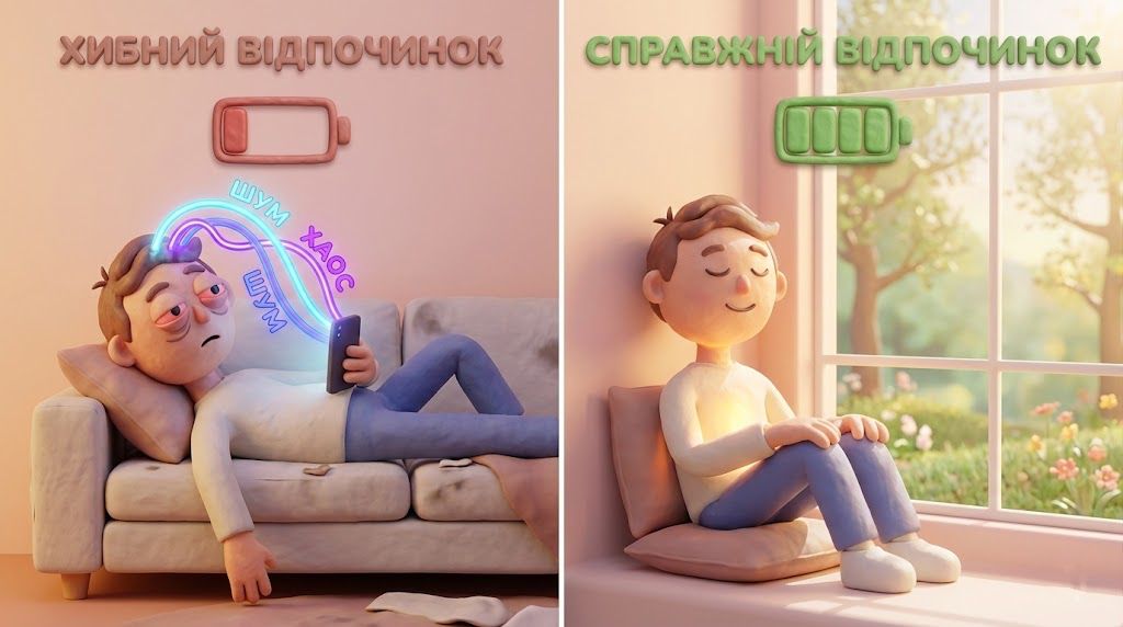 Справжній відпочинок — це нудно. І це головний критерій. Якщо вам весело (дофамін стрибає) — ви не відновлюєтесь.