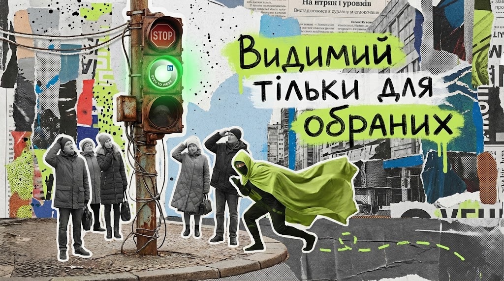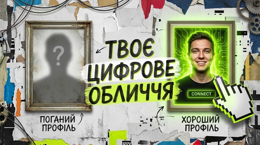 Prompt для картинки: Prompt: Mixed media collage. A gallery wall. One frame holds a boring, grey, blurry silhouette (bad profile). The next frame holds a vibrant, sharp, confident portrait glowing with lime green energy (good profile). A cursor hand is hovering over the glowing one to click “Connect”. Text in Ukrainian overlaid in bold font: “Твоє цифрове обличчя”. 16:9 aspect ratio.