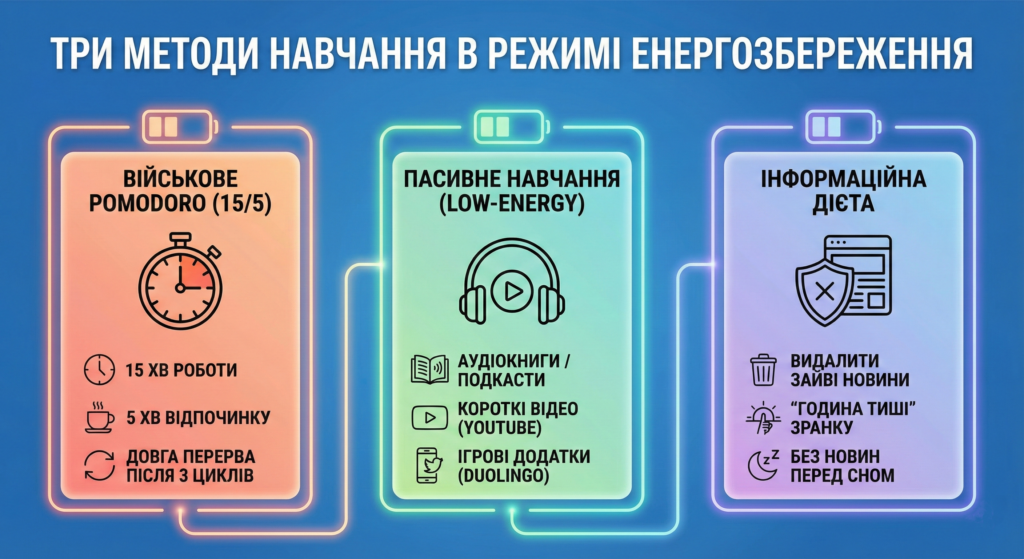 Головне правило: Знизь планку до плінтуса. Забудь про “продуктивність” з мирного часу. Твоє завдання — не стати героєм, а просто не зупинитися повністю. Ось три методи для “навчання в режимі енергозбереження”.