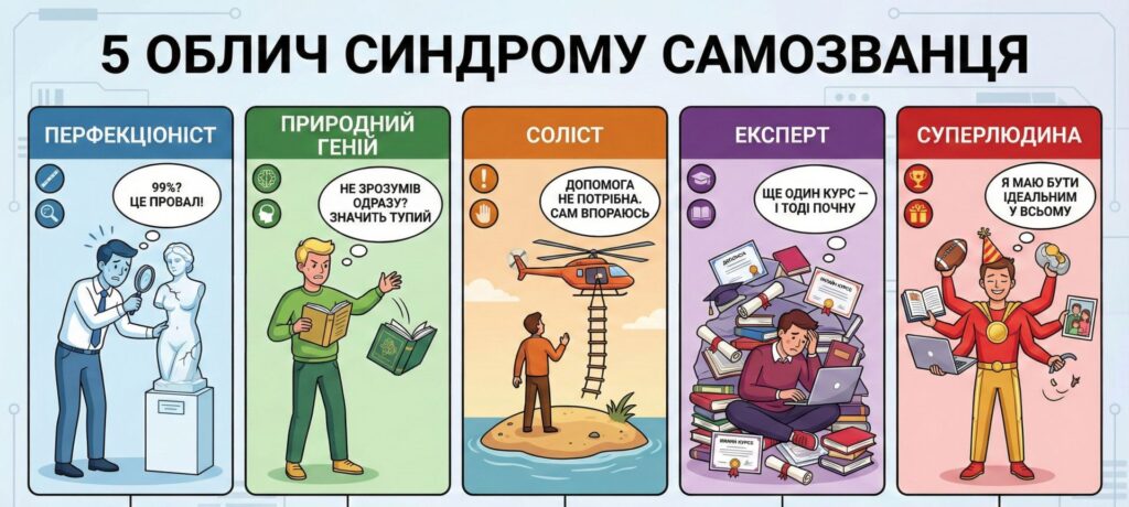 Відома дослідниця доктор Валері Янг вивчала найуспішніших людей світу і виявила, що “самозванець” має 5 різних масок. Тобі треба знати ворога в обличчя, щоб підібрати правильну “протиотруту”.