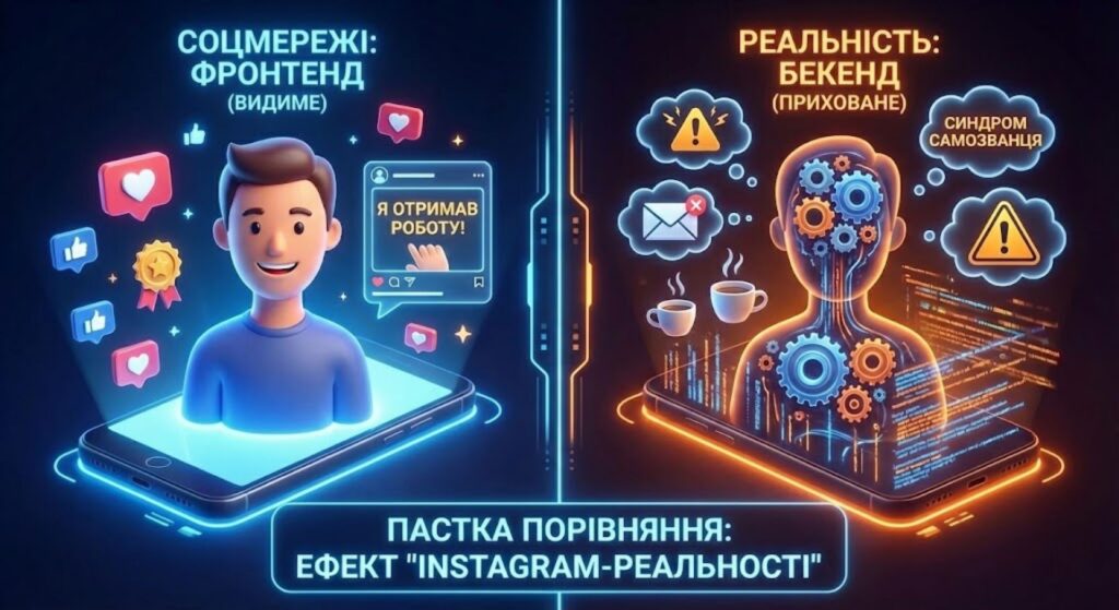 - 🖥 Твій погляд на інших (Frontend): Ти бачиш тільки їхній красивий інтерфейс. Відредаговані фото, дипломи, пости про “успішний оффер в IT-компанію”. Ти не бачиш їхніх багів і помилок.