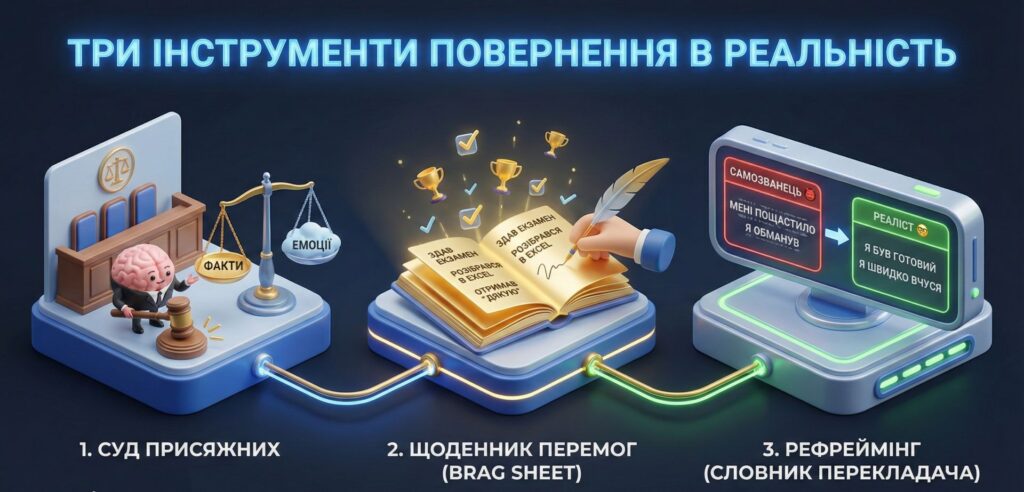 Адвокати не працюють з емоціями (“мені сумно”). Вони працюють з доказами (“ось диплом”, “ось відгук клієнта”). Кожного разу, коли тебе накриває паніка, зроби вправу “Суд”: